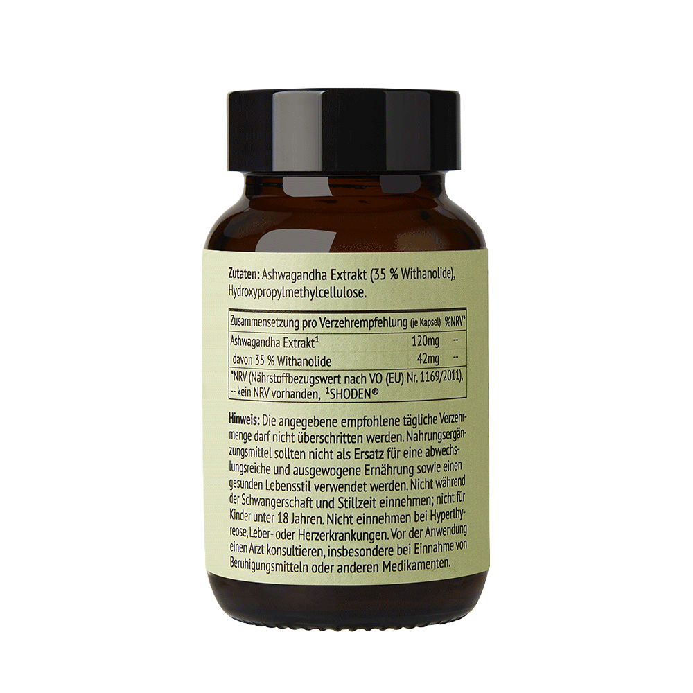 Zutaten: Ashwagandha Extrakt (SHODEN®, 35 % Withanolide), Hydroxypropylmethylcellulose (Kapselhülle)