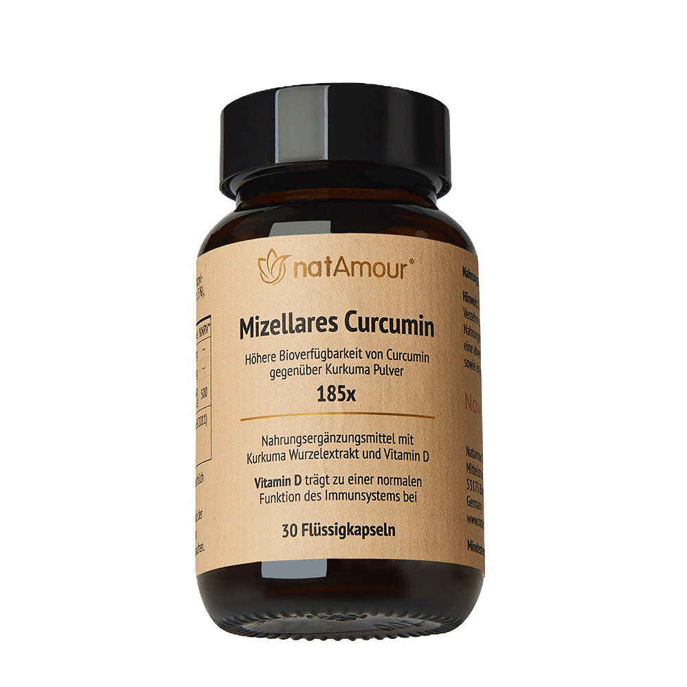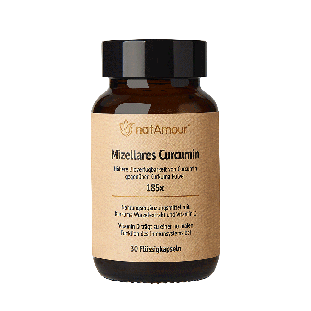 Ein grundlegendes Problem bei der Verwendung von Kurkuma Extrakten besteht allerdings darin, dass Curcumin sich nicht sehr gut in Wasser löst bzw. eine eher geringe Bioverfügarkeit seiner aktiven Komponenten aufweist. Daher setzen wir in unserem natAmour® Mizellaren Curcumin Produkt als aktiven Inhaltsstoff NovaSOL® CURCUMIN ein, da dieser aufgrund seiner patentierten Mizellen Technologie eine deutlich bessere Wasserlöslichkeit und eine durch eine klinische Studie belegte verbesserte Bioverfügbarkeit (185 fach gegenüber einfachem Kurkuma Pulver) aufzeigt. Schiborr et al. 2014.(1))