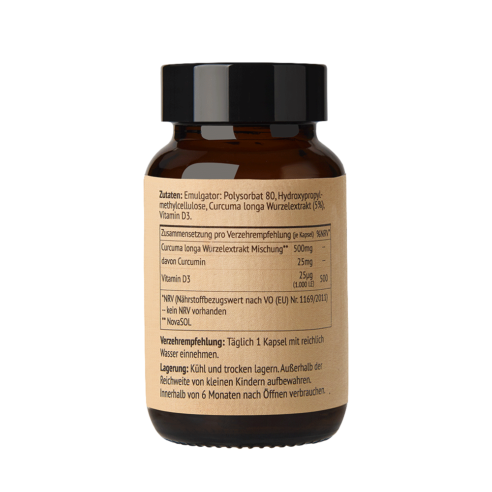 Zutaten: Emulgator Polysorbat 80, Curcuma longa Wurzelextrakt, Hydroxypropylmethylcellulose, Vitamin D3