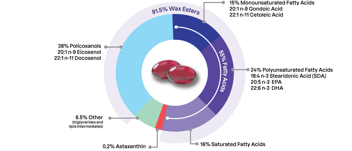 Zu den wichtigsten Bestandteilen gehören Omega-3-Fettsäuren wie Eicosapentaensäure (EPA), Docosahexaensäure (DHA) und Stearidonsäure (SDA). Darüber hinaus enthält es einfach ungesättigte Fettsäuren (MUFAs) wie Cetolsäure und Gondosäure.
